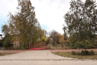 Działka ogrodzona siatką, z bramą wjazdową.